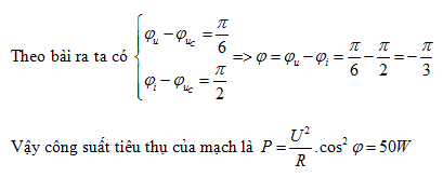Khi đó điện áp tức thời giữa hai bản tụ và điện áp tức thời giữa hai đầu mạch lệch pha một góc π/6. Công suất tiêu thụ của mạch là