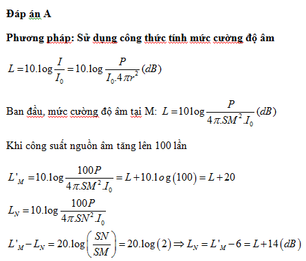 Xét hai điểm M, N ở trong môi trường đàn hồi có sóng âm phát ra từ nguồn S truyền qua. Biết S, M, N thẳng hàng và SN = 2 SM. Ban đầu, mức cường độ âm tại M là L (dB). Nếu công suất của nguồn phát tăng lên 100 lần thì mức cường độ âm tại điểm N bằng