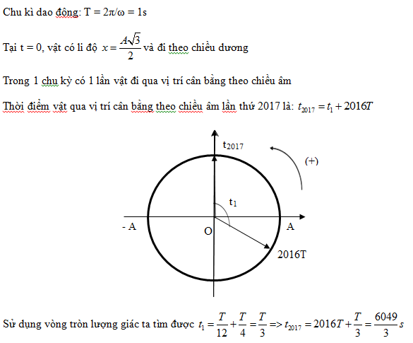 Một vật dao động điều hòa có phương trình x = Acos(2πt - π/6)(t tính bằng s). Tính từ thời điểm ban đầu t = 0, khoảng thời gian vật qua vị trí cân bằng lần thứ 2017, theo chiều âm là