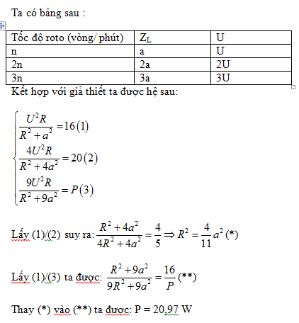Nối hai đầu một máy phát điện xoay chiều một pha (bỏ qua điện trở thuần của các cuộn dây máy phát) vào hai đầu đoạn mạch mắc nối tiếp gồm điện trở R và cuộn cảm thuần. Khi rôto quay với tốc độ n vòng/phút thì công suất tiêu thụ của đoạn mạch là 16 W.Khi rôto quay với tốc độ 2n vòng/phút thì công suất tiêu thụ của đoạn mạch là 20 W.Khi rôto quay với tốc độ 3n vòng/phút thì công suất tiêu thụ của đoạn mạch xấp xỉ