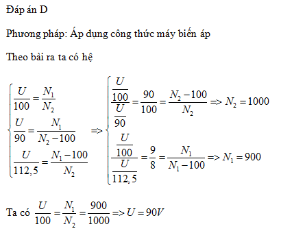 Giữ nguyên điện áp xoay chiều có giá trị hiệu dụng U không đổi ở hai đầu cuộn sơ cấp của một máy biến áp lí tưởng. Ban đầu điện áp hiệu dụng ở hai đầu cuộn thứ cấp để hở là 100 V. Bây giờ, nếu số vòng cuộn sơ cấp được giữ nguyên, số vòng cuộn thứ cấp giảm đi 100 vòng thì điện áp hiệu dụng ở hai đầu cuộn thứ cấp để hở là 90 V; còn nếu số vòng cuộn sơ cấp giảm đi 100 vòng so với lúc đầu và số vòng cuộn thứ cấp được giữ nguyên như ban đầu thì điện áp hiệu dụng ở hai đầu cuộn thứ cấp để hở là 112,5 V. Giá trị của U bằng
