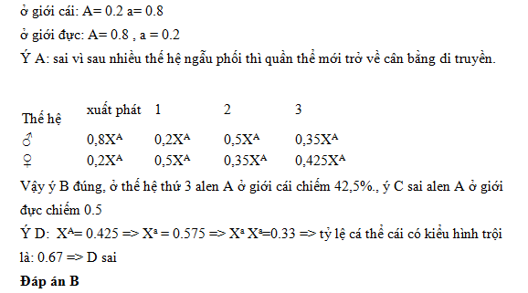 Xét một quần thể sinh sản hữu tính giao phối ngẫu nhiên có alen A quy định chân cao nằm trên vùng không tương đồng của nhiễm sắc thể X. Cặp nhiễm sắc thể giới tính ở giới đực là XY và giới cái làXX. Khảo sát trong quần thể thấy tần số alen A ở giới cái là 0,2 và giới đực là 0,8. Theo lí thuyết, nhận xét nào sau đây về quần thể là chính xác?