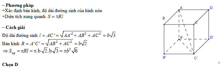 Gọi S là diện tích xung quanh của hình nón tròn xoay được sinh ra bởi đoạn thẳng AC’ của hình lập phương ABCD.A’B’C’D’ có cạnh b khi quay xung quanh trục AA’. Diện tích S là