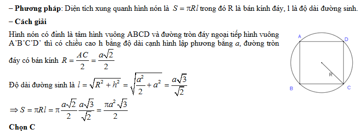 Cho hình lập phương ABCD.A’B’C’D’ có cạnh bằng a. Một hình nón có đỉnh là tâm của hình vuông ABCD và có đường tròn đáy ngoại tiếp hình vuông A’B’C’D’. Diện tích xung quanh của hình nón đó là: