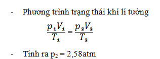 Một cái bơm chứa 100 cm3 không khí ở nhiệt độ 270C và áp suất 1(atm). Tính áp suất của không khí trong bơm khi không khí bị nén xuống còn 40cm3 và nhiệt độ tăng lên tới 370C.