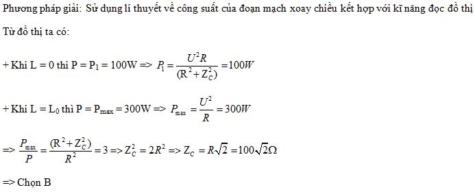 : Đặt một điện áp u=U0cosωt ( U0, ω không đổi) vào hai đầu đoạn mạch RLC nối tiếp. Cho biết R=100Ω, cuộn cảm thuần có độ tự cảm L thay đổi được. Hình bên là đồ thị biểu diễn sự phụ thuộc của công suất tiêu tụ điện của đoạn mạch theo độ tự cảm L. Dung kháng của tụ điện là