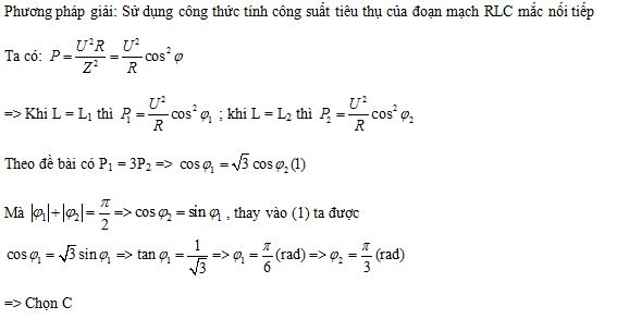 Đặt điện áp xoay chiều u=U0cosωt ( với U0,ω không đổi) vào hai đầu đoạn mạch RLC, trong đó cuộn dây thuần cảm có độ tự cảm L thay đổi. Khi L=L1 hay L=L2 với L1>L2 thì công suất tiêu thụ của mạch điện tương ứng P1, P2 với P1=3P2; độ lệch pha giữa điện áp hai đầu mạch điện với cường độ dòng điện trong mạch tương ứng φ1, φ2 với | φ1|+| φ 2|=π/2. Độ lớn của φ1 và φ2 là: