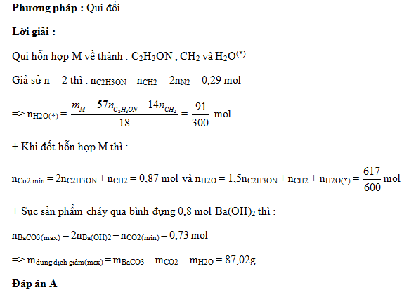 Hỗn hợp M gồm 4 peptit X, Y, Z, T(đều mạch hở) chỉ tạo ra từ các a-amino axit có dạng H2NCnH2nCOOH (n ≥ 2). Đốt cháy hoàn toàn 26,05g M, rồi cho sản phẩm cháy(chỉ gồm CO2, H2O và N2) vào bình đựng 800 ml dung dịch Ba(OH)2 1M sau khí các phản ứng xảy ra hoàn toàn có 3,248 lit (dktc) một chất khí duy nhất thoát ra và thu được dung dịch E (chứa muối axit) có tổng khối lượng giảm m gam so với khối lượng dung dịch Ba(OH)2 ban đầu. Giá trị của m gần nhất với giá trị nào sau đây :