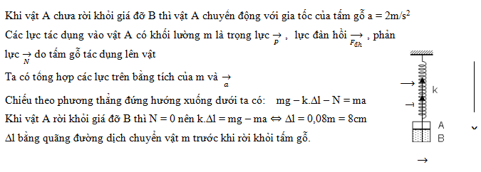 Một con lắc lò xo thẳng đứng gồm vật nặng khối lượng m = 1kg và lò xo có độ cứng k = 100N/m. Vật nặng được đặt trên giá đỡ nằm ngang sao cho lò xo không biến dạng. Cho giá đỡ đi xuống không vận tốc ban đầu nhanh dần đều với gia tốc a = g/5 = 2m/s2. Chọn phương án đúng