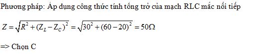 Mạch điện xoay chiều gồm RLC mắc nối tiếp, có R = 30 , ZC = 20 , ZL = 60 . Tổng trở của mạch là: