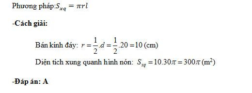 Một hình nón có đường kính đáy bằng 20cm, độ dài đường sinh bằng 30cm. Tính diện tích xung quanh hình nón đó.