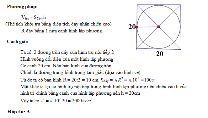 Cho hình trụ có hai đường tròn đáy lần lượt nội tiếp hai hình vuông đối diện của một hình lập phương có cạnh 20 cm. Tính thể tích khối trụ đó.