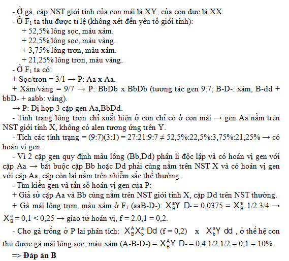 Cho gà trống lông sọc, màu xám giao phối với gà mái có cùng kiểu hình. Ở F1 thu được tỉ lệ: 37,5% gà trống lông sọc, màu xám; 12,5% gà trống lông sọc, màu vàng: 15% gà mái lông sọc, màu xám: 3,75% gà mái lông trơn, màu xám: 21,25% gà mái lông trơn, màu vàng: 10% gà mái lông sọc, màu vàng. Nếu cho gà trống ở thế hệ bố mẹ lai phân tích thì tính theo lý thuyết, tỉ lệ gà mái lông sọc, màu xám thu được là bao nhiêu?