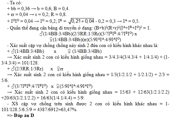 Ở người, xét 3 cặp gen qui định 3 cặp tính trạng nằm trên 3 cặp NST thường khác nhau: alen R qui định răng bình thường trội hoàn toàn so với alen lặn r qui định răng khểnh; alen B thuận tay phải trội hoàn toàn so với alen lặn b quy định thuận tay trái; nhóm máu ABO do 3 alen IA,IB đồng trội so với IO. Biết rằng cả ba tính trạng này đều thể hiện hiện tượng ngẫu phối và cân bằng di truyền qua các thế hệ. Trong một quần thể cân bằng, người ta thống kê độc lập thấy có 64% người thuận tay phải; 4% số người có răng khểnh; 4% số người có nhóm máu O và 21% số người có nhóm máu B. Nếu một người đàn ông thuận tay phải, răng bình thường, máu B và một người phụ nữ thuận tay phải, răng khểnh, máu A trong quần thể này lấy nhau thì khả năng họ sinh ra hai đứa con có kiểu hình khác nhau là bao nhiêu?