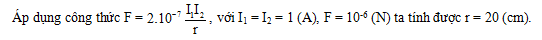 Hai dây dẫn thẳng, dài song song đặt trong không khí. Dòng điện chạy trong hai dây có cùng cường độ 1 (A). Lực từ tác dụng lên mỗi mét chiều dài của mỗi dây có độ lớn là 10-6(N). Khoảng cách giữa hai dây đó là: