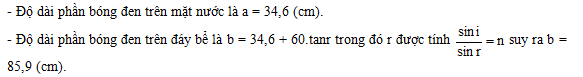 Một bể chứa nước có thành cao 80 (cm) và đáy phẳng dài 120 (cm) và độ cao mực nước trong bể là 60 (cm), chiết suất của nước là 4/3. Ánh nắng chiếu theo phương nghiêng góc 300 so với phương ngang. Độ dài bóng đen tạo thành trên đáy bể là: