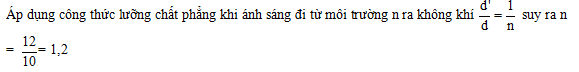 Một điểm sáng S nằm trong chất lỏng (chiết suất n), cách mặt chất lỏng một khoảng 12 (cm), phát ra chùm sáng hẹp đến gặp mặt phân cách tại điểm I với góc tới rất nhỏ, tia ló truyền theo phương IR. Đặt mắt trên phương IR nhìn thấy ảnh ảo S’ của S dường như cách mặt chất lỏng một khoảng 10 (cm). Chiết suất của chất lỏng đó là