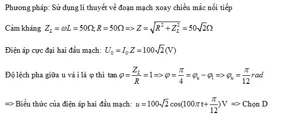 Cho một đoạn mạch điện xoay chiều gồm điện trở R = 50 Ω và cuộn cảm thuần có hệ số tự cảm L = 1/2π H. Cường độ dòng điện chạy qua đoạn mạch có biểu thức i = 2cos(100πt – π/6) A. Biểu thức điện áp hai đầu mạch là