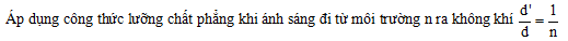 Một người nhìn hòn sỏi dưới đáy một bể nước thấy ảnh của nó dường như cách mặt nước một khoảng 1,2 (m), chiết suất của nước là n = 4/3. Độ sâu của bể là: