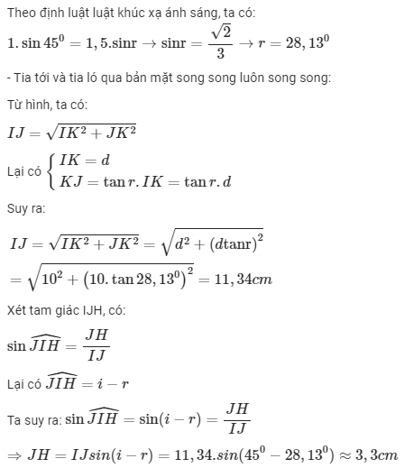 Một bản mặt song song có bề dày 10 (cm), chiết suất n = 1,5 được đặt trong không khí. Chiếu tới bản một tia sáng SI có góc tới 450 . Khoảng cách giữa giá của tia tới và tia ló là: