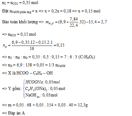 Hợp chất X có thành phần gồm C, H, O, chứa vòng benzen. Cho 6,9 gam X vào 360 ml dung dịch NaOH 0,5M (dư 20% so với lượng cần phản ứng) đến phản ứng hoàn toàn, thu được dung dịch Y. Cô cạn Y thu được m gam chất rắn khan. Mặt kh ác, đốt cháy hoàn toàn 6,9 gam X cần vừa đủ 7,84 lít O2 (đktc), thu được 15,4 gam CO2. Biết X có công thức phân tử trùng với công thức đơn giản nhất. Giá trị của m là