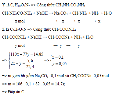 Hỗn hợp X gồm chất Y (C2H10O3N2) và chất Z (C2H7O2N). Cho 14,85 gam X phản ứng vừa đủ với dung