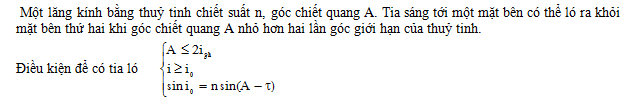 Một lăng kính bằng thuỷ tinh chiết suất n, góc chiết quang A. Tia sáng tới một mặt bên có thể ló ra khỏi mặt bên thứ hai khi