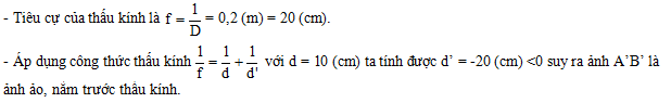 Vật sáng AB đặt vuông góc với trục chính của một thấu kính hội tụ có độ tụ D = + 5 (đp)