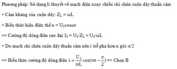 Đặt vào hai đầu một cuộn dây thuần cảm (cảm thuần) có độ tự cảm L một hiệu điện thế u = U0cosωt. Cường độ dòng điện chạy qua cuộn dây có biểu thức là