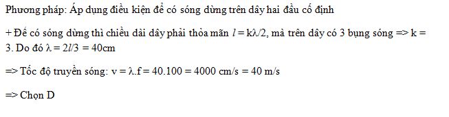 Một sợi dây đàn hồi căng ngang, dài 60 cm, hai đầu cố định. Trên dây đang có sóng dừng với 3 bụng sóng, tần số sóng là 100 Hz. Tốc độ truyền sóng trên dây là