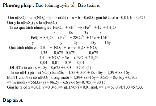 Hòa tan hoàn toàn hỗn hợp gồm FeS2 và Fe3O4 bằng 100 gam dung dịch HNO3 a % vừa đủ thu được 15,344 lít hỗn hợp khí gồm NO và NO2 có khối lượng 31,35 gam và dung dịch chỉ chứa 30,15 gam hỗn hợp muối. Giá trị của a gần nhất với