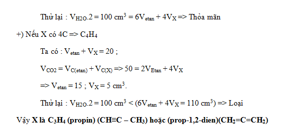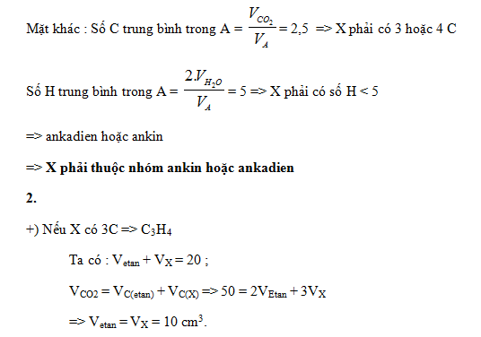 Đốt cháy hoàn toàn 20 cm3 hỗn hợp A gồm etan và 1 hidrocacbon X mạch hở, thu được 100 cm3 hỗn hợp khí B gồm CO2 và hơi nước (các thể tích khí đo ở cùng điều kiện nhiệt độ và áp suất). Tỉ khối của B so với H2 là 15,5.