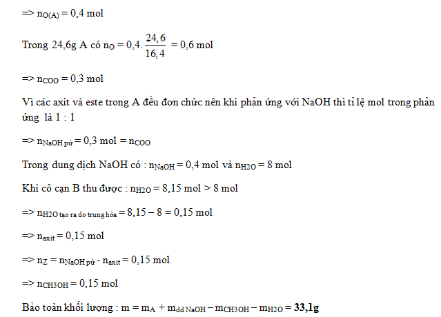 2. Đốt cháy hoàn toàn 16,4g hỗn hợp A gồm 2 axit cacboxylic đơn chức X, Y và 1 este đơn chức Z thu được 16,8 lit CO2 (dktc) và 9,0g H2O. Mặt khác, cho 24,6g hỗn hợp A trên tác dụng hết với 160 gam dung dịch NaOH 10%, sau khi các phản ứng xảy ra hoàn toàn thu được dung dịch B. Cô cạn dung dịch B, thu được m gam chất rắn khan; CH3OH và 146,7g H2O (coi H2O bay hơi không đáng kể trong phản ứng của A với dung dịch NaOH).