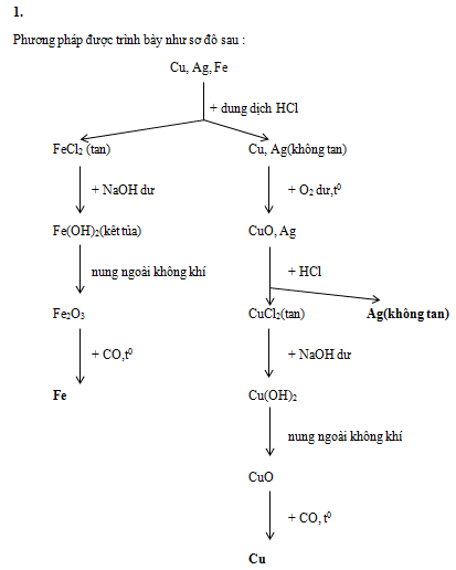 1. Một hỗn hợp gồm Cu, Ag và Fe. Trình bày phương pháp tách riêng từng kim loại ra khỏi hỗn hợp? (các hóa chất và điều kiện cần thiết coi như có đủ)