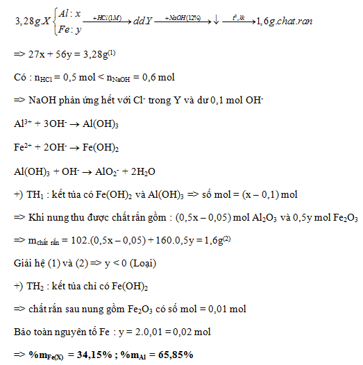 2. Hòa tan hoàn toàn 3,28g hỗn hợp X gồm Al và Fe trong 500 ml dung dịch HCl 1M được dung dịch Y. Thêm 200 gam dung dịch NaOH 12% vào dung dịch Y sau đó đem kết tủa nung ngoài không khí đến khối lượng không đổi thu được 1,6g chất rắn. Tính thành phần phần trăm về khối lượng các kim loại trong hỗn hợp X.
