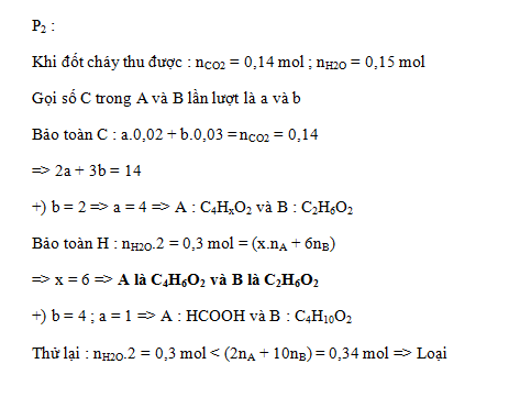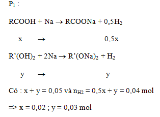 Chất A có công thức RCOOH, B có công thức R’(OH)2 trong đó R và R’ là các gốc hidrocacbon mạch hở. Hỗn hợp X vừa trộn gồm 2 chất A và B. Chia X thành 2 phần bằng nhau, mỗi phần chứa 0,05 mol 2 chất.