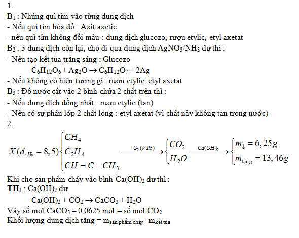 1. Cho 4 lọ mất nhãn, mỗi lọ đựng một trong các chất sau: dung dịch glucozơ và các chất lỏng rượu etylic, axit axetic, etyl axetat. Bằng phương pháp hóa học, hãy nhận biết từng chất trên. Viết phương trình phản ứng (nếu có) và ghi rõ điều kiện.