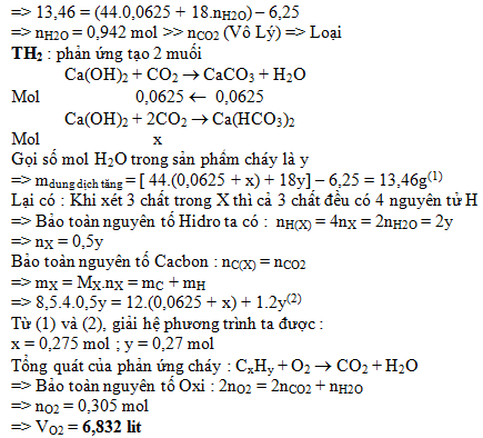 C –CH3 ) có tỷ khối hơi so với khí Heli bằng 8,5. Đốt cháy hoàn toàn V lít (đktc) hỗn hợp X bằng khí oxi, sau đó cho toàn bộ sản phẩm cháy qua bình chứa dung dịch Ca(OH)2. Sau phản ứng thấy xuất hiện 6,25 gam kết tủa và khối lượng dung dịch sau phản ứng tăng 13,46 gam so với khối lượng dung dịch Ca(OH)2 ban đầu. Tính V lít.
