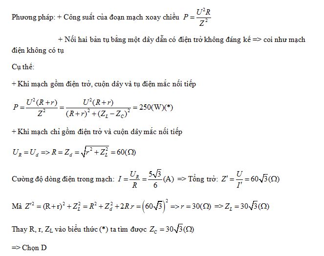 vào hai đầu đoạn mạch mắc nối tiếp gồm điện trở thuần 60Ω , cuộn dây (có điện trở thuần) và tụ điện. Công suất tiêu thụ điện của đoạn mạch bằng 250 W. Nối hai bản tụ điện bằng một dây dẫn có điện trở không đáng kể. Khi đó, điện áp hiệu dụng giữa hai đầu điện trở bằng điện áp hiệu dụng giữa hai đầu cuộn dây và bằng