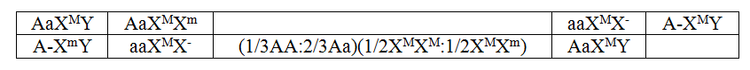 Ở người, bệnh điếc bẩm sinh do alen a nằm trên nhiễm sắc thể thường quy định, alen A quy định tai nghe bình thường; bệnh mù màu do alen m nằm trên vùng không tương đồng của nhiễm sắc thể X quy định, alen M quy định nhìn màu bình thường. Một cặp vợ chồng có kiểu hình bình thường. Bên vợ có anh trai bị mù màu, em gái bị điếc bẩm sinh; bên chồng có mẹ bị điếc bẩm sinh. Những người còn lại trong hai gia đình trên đều có kiểu hình bình thường. Xác suất cặp vợ chồng trên sinh con đầu lòng là gái và không mắc cả hai bệnh trên là: