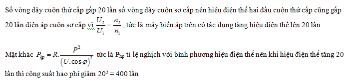 Một máy biến áp lí tưởng có số vòng dây cuộn thứ cấp gấp 20 lần số vòng dây cuộn sơ cấp, được đặt ở đầu đường dây tải điện áp. So với khi dùng máy biến áp thì công suất tiêu hao điện năng trên đường dây