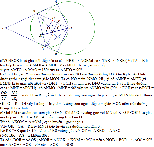 Cho đường tròn (O,R) và điểm T nằm ngoài đường tròn. Qua điểm T kẻ hai tiếp tuyến TA và TB đến (O,R) A và B là các tiếp điểm . Trên đoạn thẳng TA lấy điểm M( M khác T và A) gọi E là giao điểm của đoạn thẳng qua E vuông góc với MO cắt đoạn thẳng TB tại N, NO cắt đoạn thẳng AB tại F.