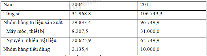 Với bảng số liệu: Giá trị nhập khẩu phân theo nhóm hàng ( đơn vị: triệu đô la Mỹ) Nguồn: