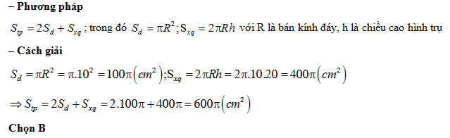 Cho hình trụ có chiều cao bằng 20cm và bán kính đáy bằng 10cm. Diện tích toàn phần của hình