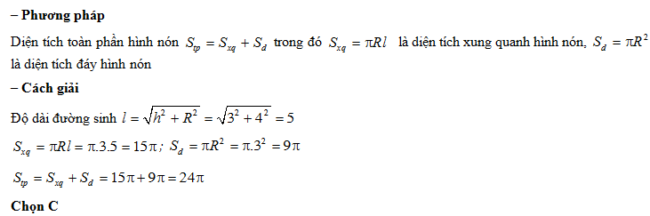 Cho hình nón có chiều cao bằng 4 và bán kính đáy bằng 3. Diện tích toàn phần của hình nón là: