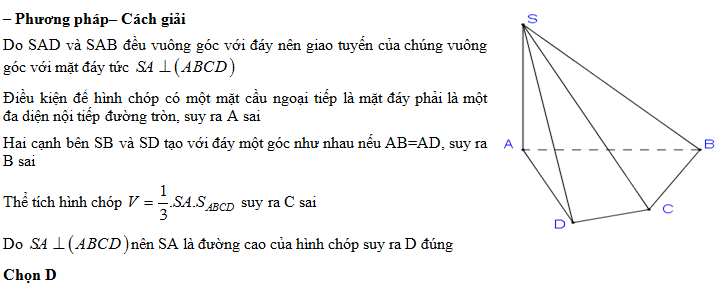 Cho hình chóp S.ABCD có hai mặt bên SAB và SAD nằm trong hai mặt phẳng cùng vuông góc với mặt phẳng chứa đáy. Khẳng định nào sau đây là đúng