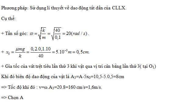 Con lắc lò xo trên mặt phẳng ngang gồm lò xo nhẹ có độ cứng 40 N/m, một đầu gắn với vật nặng m=100g, đầu kia cố định. Hệ số ma sát giữa vật và mặt phẳng ngang là µ=0,2. Kéo vật dọc theo trục lò xo để lò xo giãn 10,5 cm rồi thả không vận tốc ban đầu. Tốc độ của vật ở thời điểm gia tốc của nó triệt tiêu lần thứ 3 là