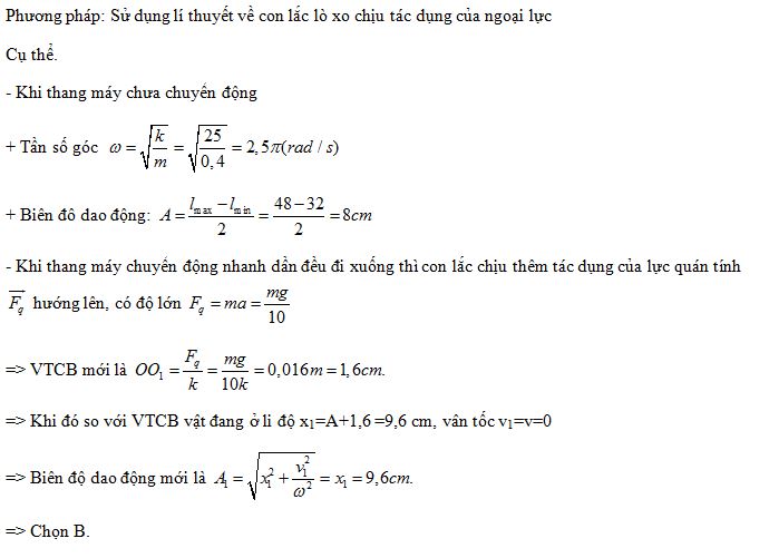 Trong thang máy, tại trần người ta treo một con lắc lò xo có độ cứng k=25 N/m, vật nặng có khối lượng 400 g. Khi thang máy đứng yên ta cho con lắc dao động điều hòa, chiều dài con lắc thay đổi từ 32 cm đến 48 cm. Tại thời điểm mà vật ở vị trí thấp nhất thì cho thang máy đi xuống nhanh dần đều với gia tốc a=g/10. Lấy g=π2 m/s2=10 m/s2. Biên độ dao động của vật trong trường hợp này là