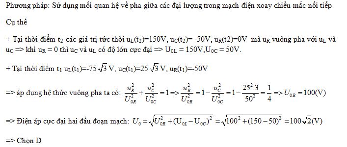 V, uR(t1)=-50V. Tại thời điểm t2 các giá trị tức thời uL(t2)=150V, uC(t2)=