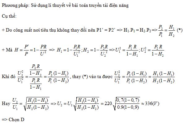Người ta truyền tải điện năng đến một nơi tiêu thụ điện bằng đường dây một pha có điện trở R. Nếu điện áp hiệu dụng đưa lên đường dây là 220V thì hiệu suất truyền tải điện năng là 70%. Để hiệu suất truyền tải tăng đến 90% mà công suất nơi tiêu thụ nhận được vẫn không thay đổi thì điện áp hiệu dụng đưa lên hai đầu đường dây bằng bao nhiêu?